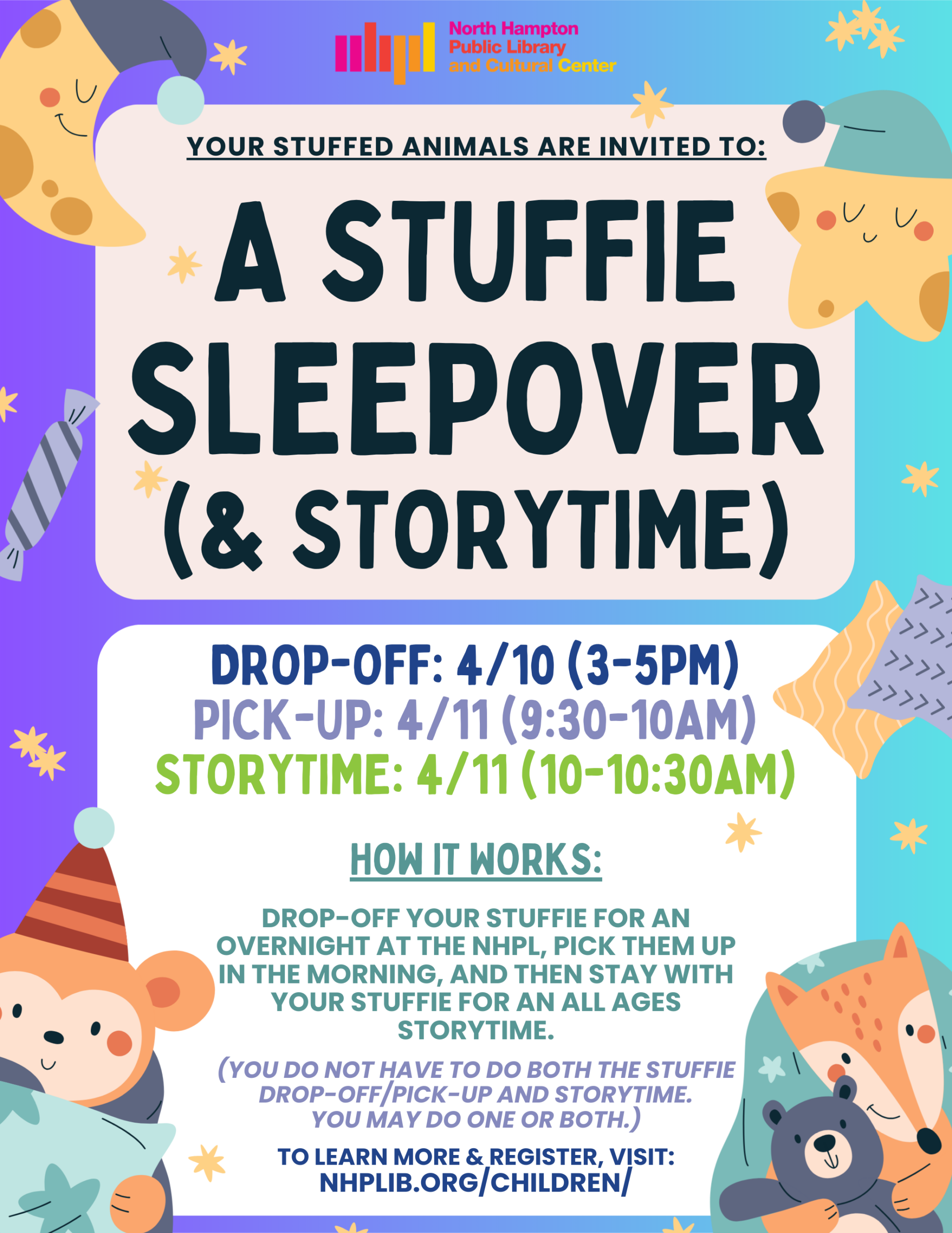 Join us for a very special weekend! Drop-off your stuffie for an overnight at the NHPL, pick them up in the morning, and then stay with your STUFFIE for an all ages storytime.
